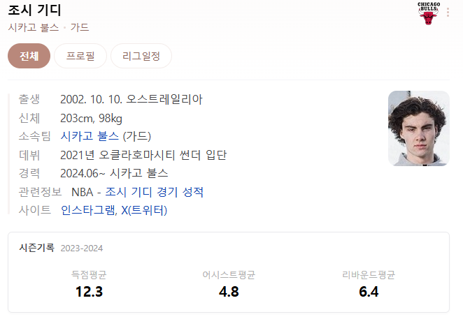 - Josh Giddey(시카고 불스, 가드) : 조시 기디는 2002년생이며, 이 젊은 가드는 코트 비전과 다재다능함으로 유명한 NBA의 떠오르는 스타로 빠르게 자리매김했습니다.