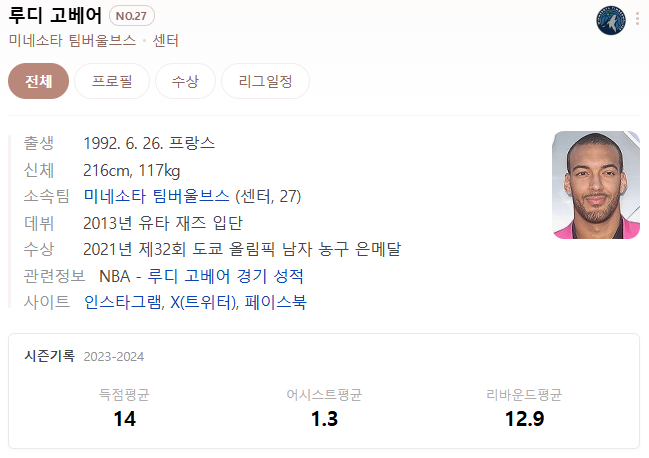 - Rudy Gobert (미네소타 팀버울브스) : 루디 고베어는 수비 능력으로 잘 알려진 고베어는 NBA 올해의 수비 선수로 3회 선정되었습니다.