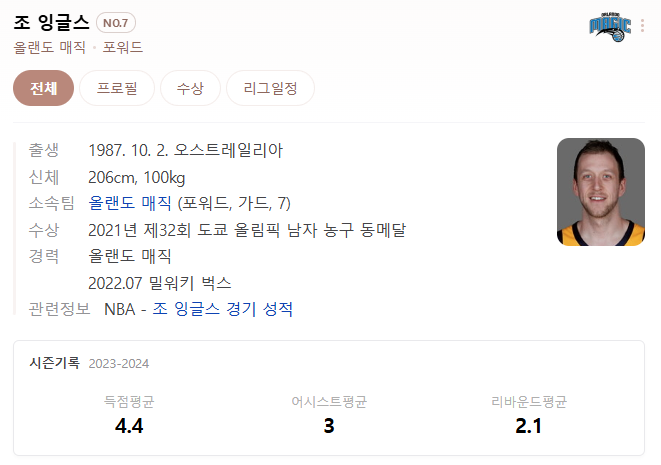 - JOE INGLES (올랜도 매직, 포워드) : 조 잉글스는 뛰어난 슈팅 능력과 플레이메이킹 능력을 갖춘 다재다능한 공격수입니다.